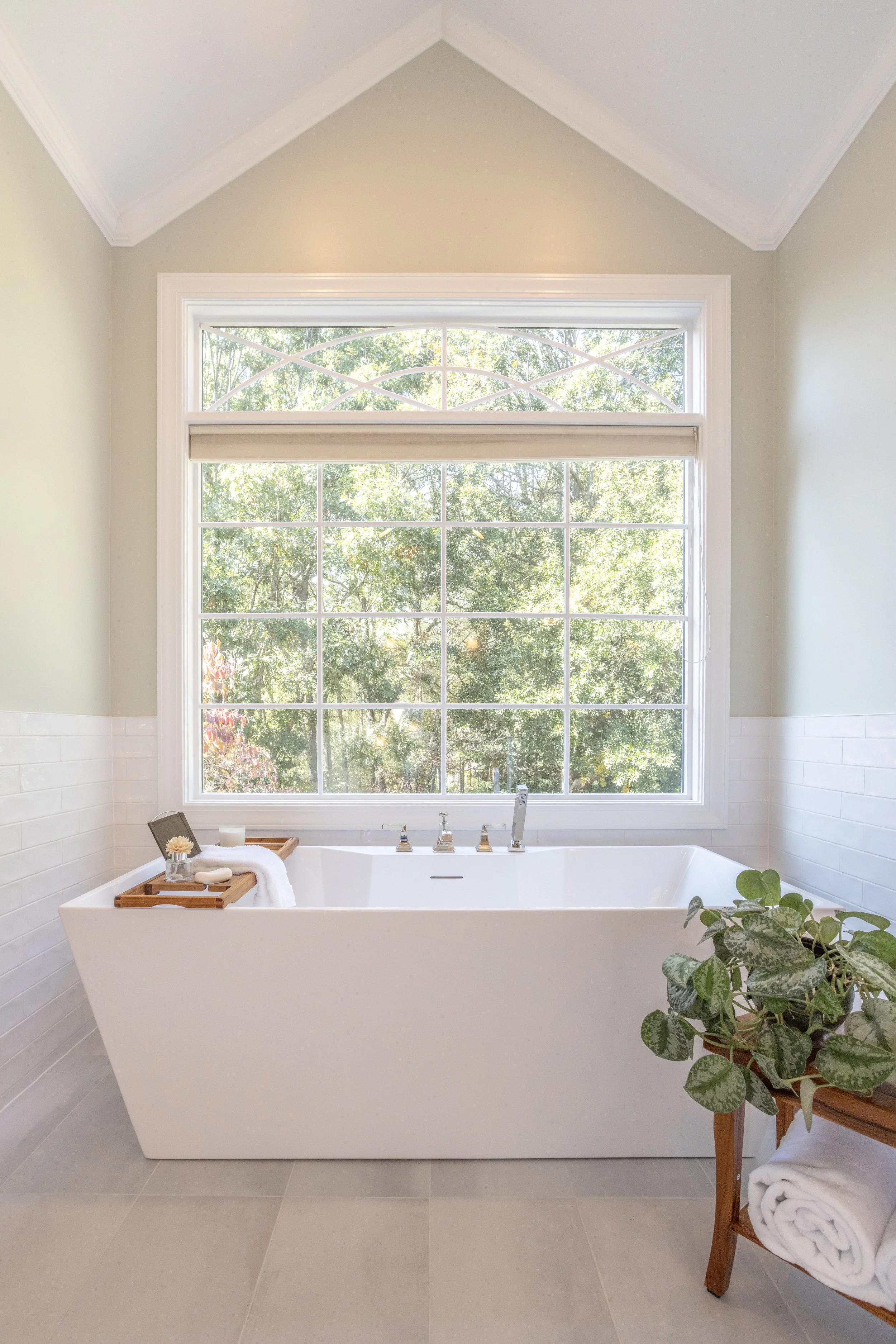 Our clients chose to center their tub underneath the bathroom’s window to create an even more dramatic focal point. The rectangular tub may have a minimalist shape, but its 67” length commands the attention of the room.