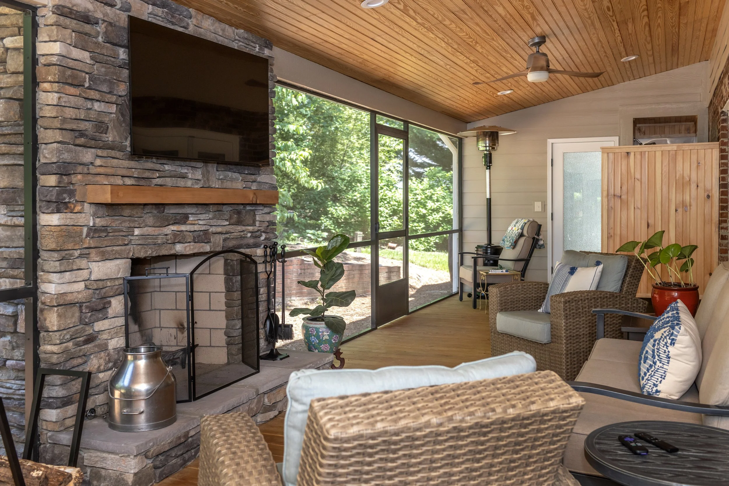South Carolina’s long summers and mild winters mean that screened porches are pretty much a requirement for homes here. Screened porches make up a large part of our project portfolio; with many clients using the addition as a secondary living space. Our clients made sure that their porch could be used year-round with a large fireplace for winter, an outdoor shower for spring and summer, and a large screen TV for fall football games.