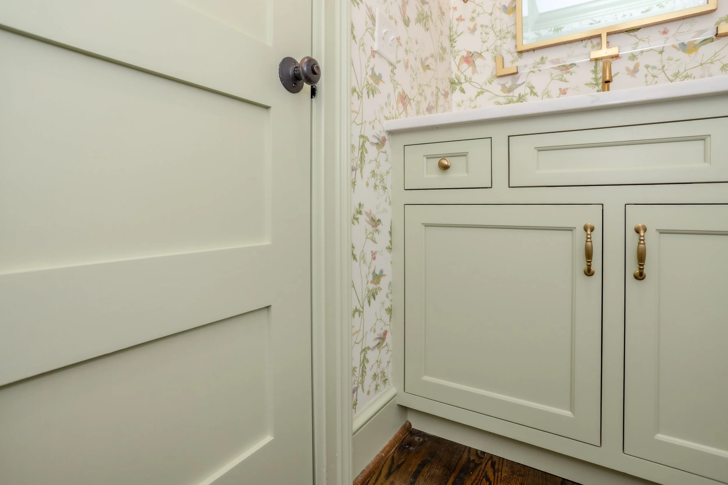 Cabinets, door, and trim painted Cooking Apple Green by Farrow and Ball